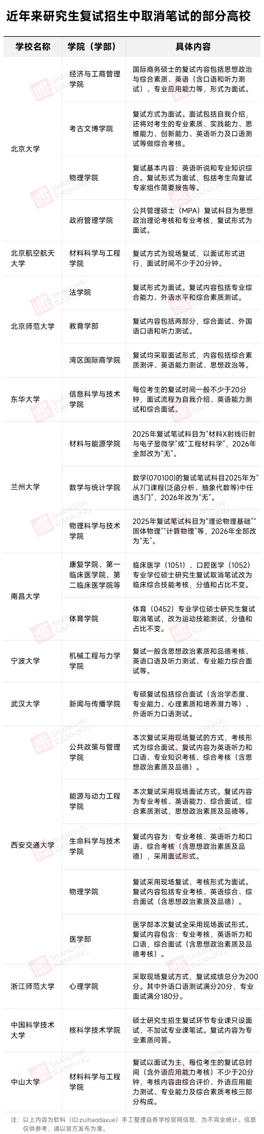 除了此前已调整的4个学院(机械工程与自动化学院、资源与土木工程学院、外国语学院、马克思主义学院)外,理学院、材料科学与工程学院等12个学院/教学部的全部专业均宣布取消笔试。
