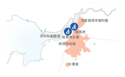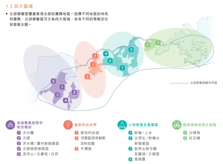 香港特区政府规划中的北部都会区,覆盖四大板块,其中包括创新科技地带、口岸商贸及产业区、高端专业服务和物流枢纽、蓝绿康乐旅游生态圈。