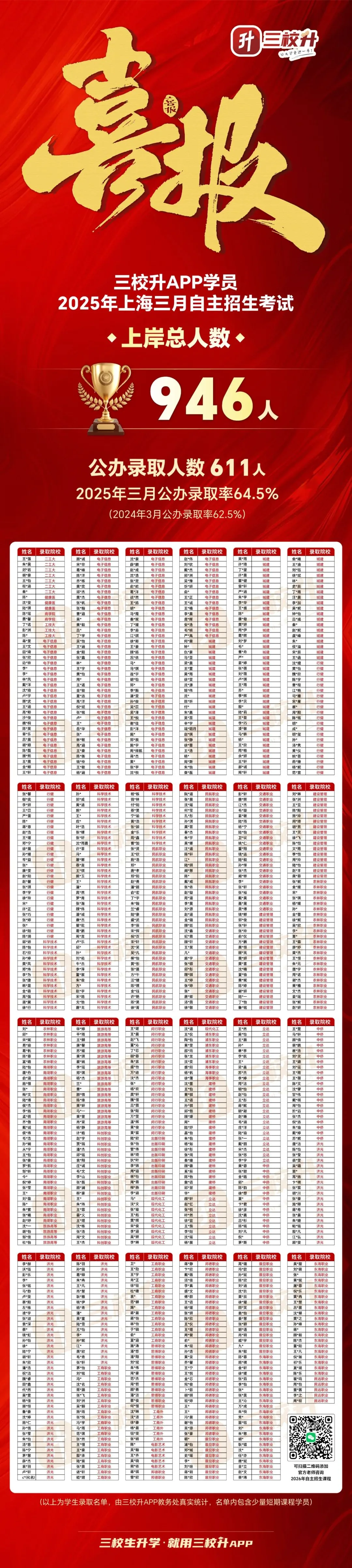 六、【三月录取】喜报!上岸946人!2025年上海专科自主招生(三校升APP)录取学员名单来啦!