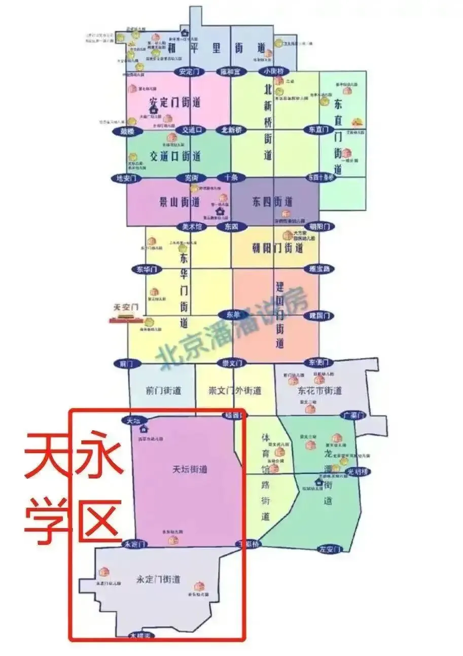 天永学区(天坛-永定门学区)主要涵盖天坛街道和永定门外街道两大板块,两个街道下辖的居委会,直接关系到房产的划片归属,是家长们选房的重要参考!