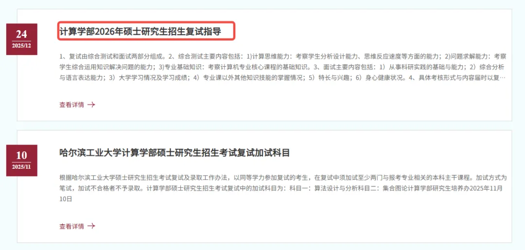 哈尔滨工业大学计算学部发布了2026年硕士研究生招生复试指导,此前还公布了复试加试科目,有报考该专业的同学一定要重点关注。