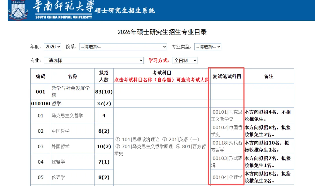 华南师范大学在26招生专业目录中明确了复试笔试科目,点击对应科目即可查看考试内容、要求等。