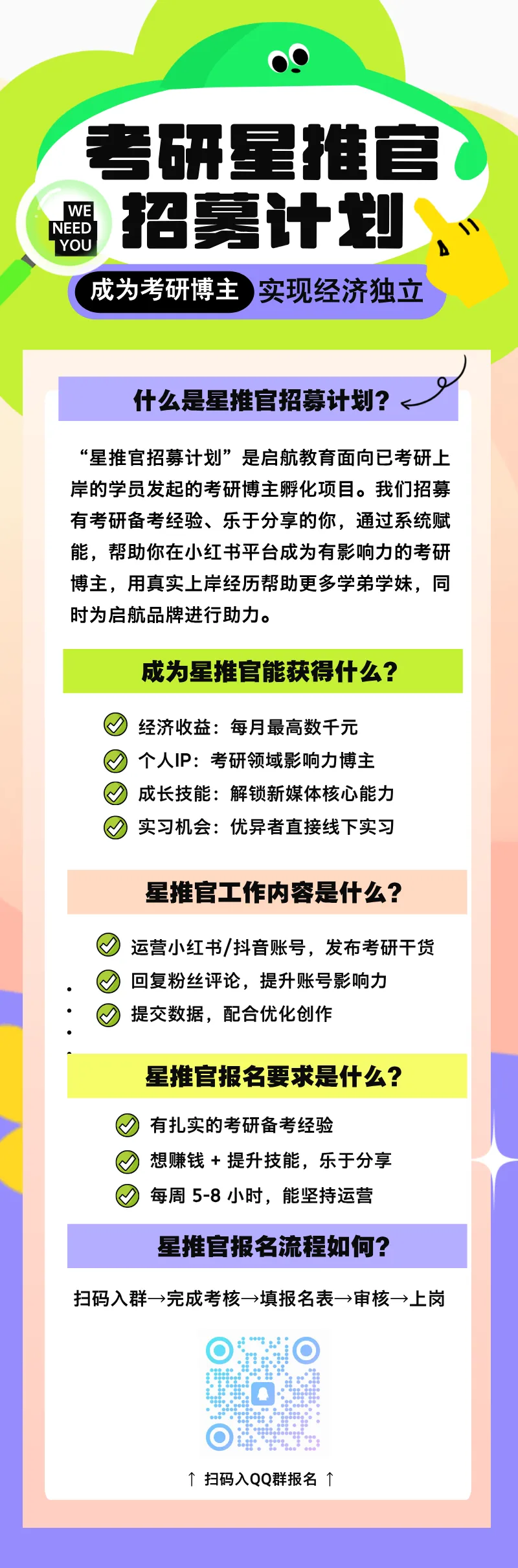 “星推官招募计划”是启航教育面向已考研上岸的学员发起的考研博主孵化项目。我们招募有考研备考经验、乐于分享的你,通过系统赋能,帮助你在小红书平台成为有影响力的考研博主,用真实上岸经历帮助更多学弟学妹,从收入、能力、经验多方面实现巨大的认知跃迁!🙋♀️🙋♀️🙋♀️