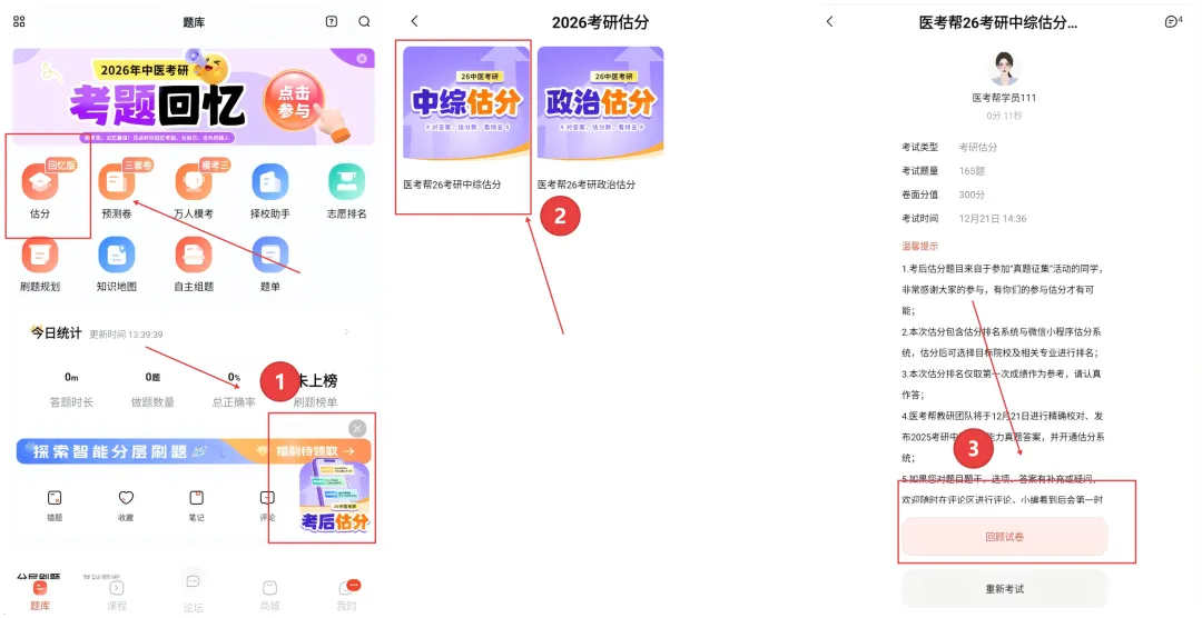 估分路径一:下载/打开医考帮APP-中医学-中医考研专硕-估分-医考帮26考研中综估分。具体操作步骤如下👇👇