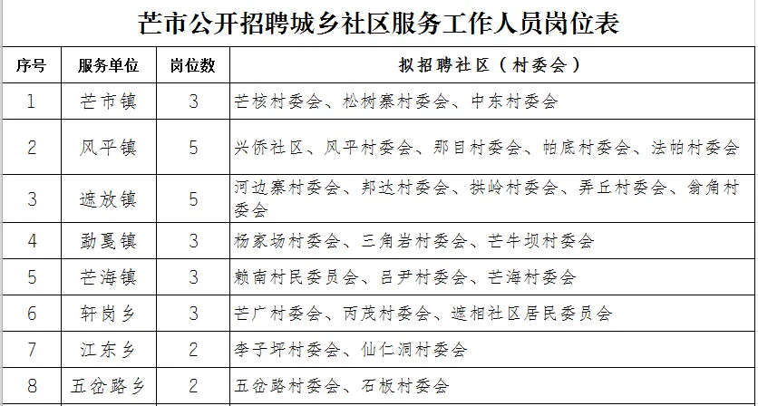 共设置村(社区)岗位招聘58人。具体岗位见《芒市公开招聘城乡社区服务工作人员岗位表》: