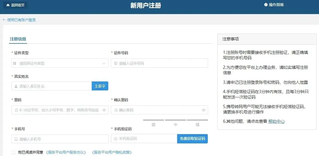 然后进入到新用户注册界面,准确输入本人证件类型、证件号码、姓名及手机号码并认真核对。