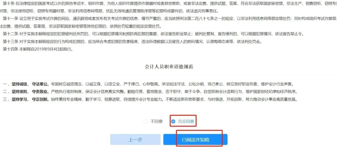 选择省份并点击进入报名后,页面展示所选择省份设置的阅读须知。选择“完全同意”,点击“已阅读并知晓”。