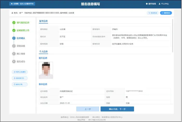 点击下一步后进入到信息确认页面,信息确认页面展示报考信息、个人信息(照片信息、基本信息、学历信息、学位信息、工作信息)、附件信息。