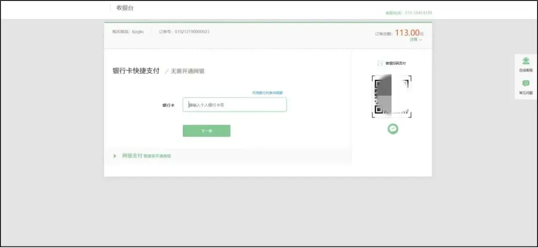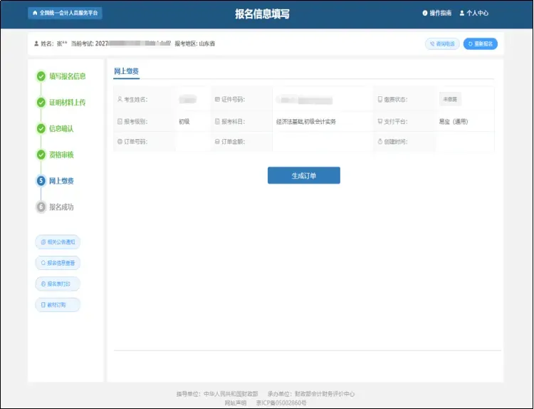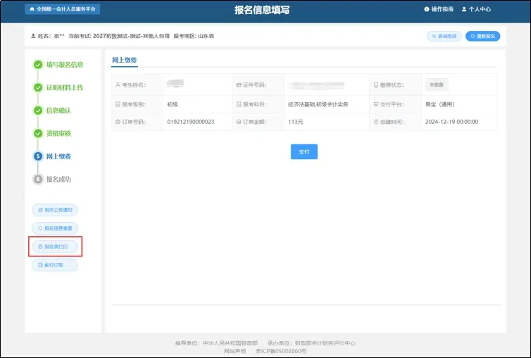 等待审核通过后,重新选择考试会直接进入到网上缴费的页面。页面展示考生报名基本信息、订单基本信息、支付平台以及缴费状态信息。