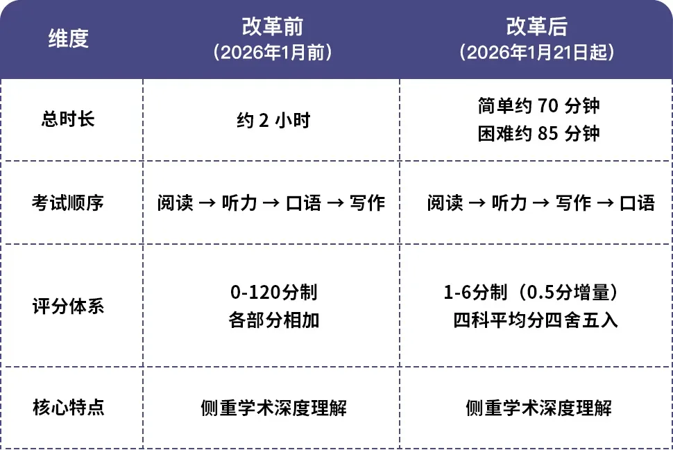 保留原有0-120分制,成绩单同时显示新分数、CEFR水平及等效旧分数,过渡期(2026年1月-2028年1月)无需担心院校认可问题。
