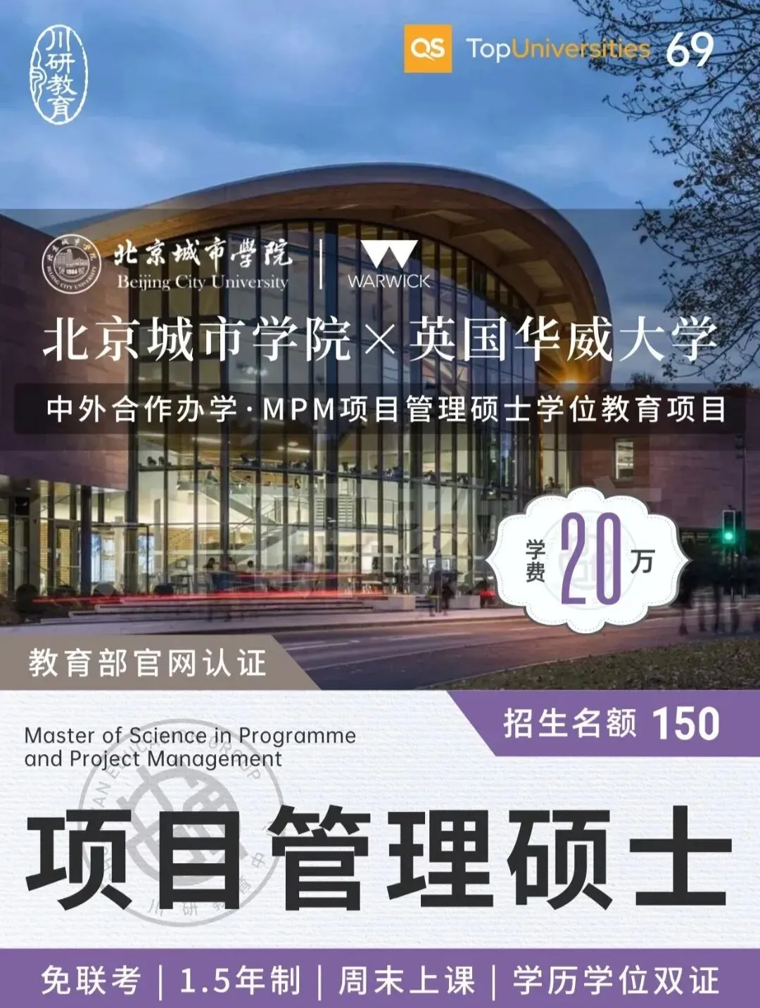 当中国高教改革标杆遇上英国罗素集团名校,北京城市大学×英国华威大学联合办学项目管理硕士,2013年获教育部批准(批准书编号MOE11UK1A20131445N),办学资质合规可查,十余载深耕培养超千名项目管理精英!2026级招生火热开启,不出国门享纯正英式教育,手握国际硕士双认证,轻松站稳职场晋升C位!