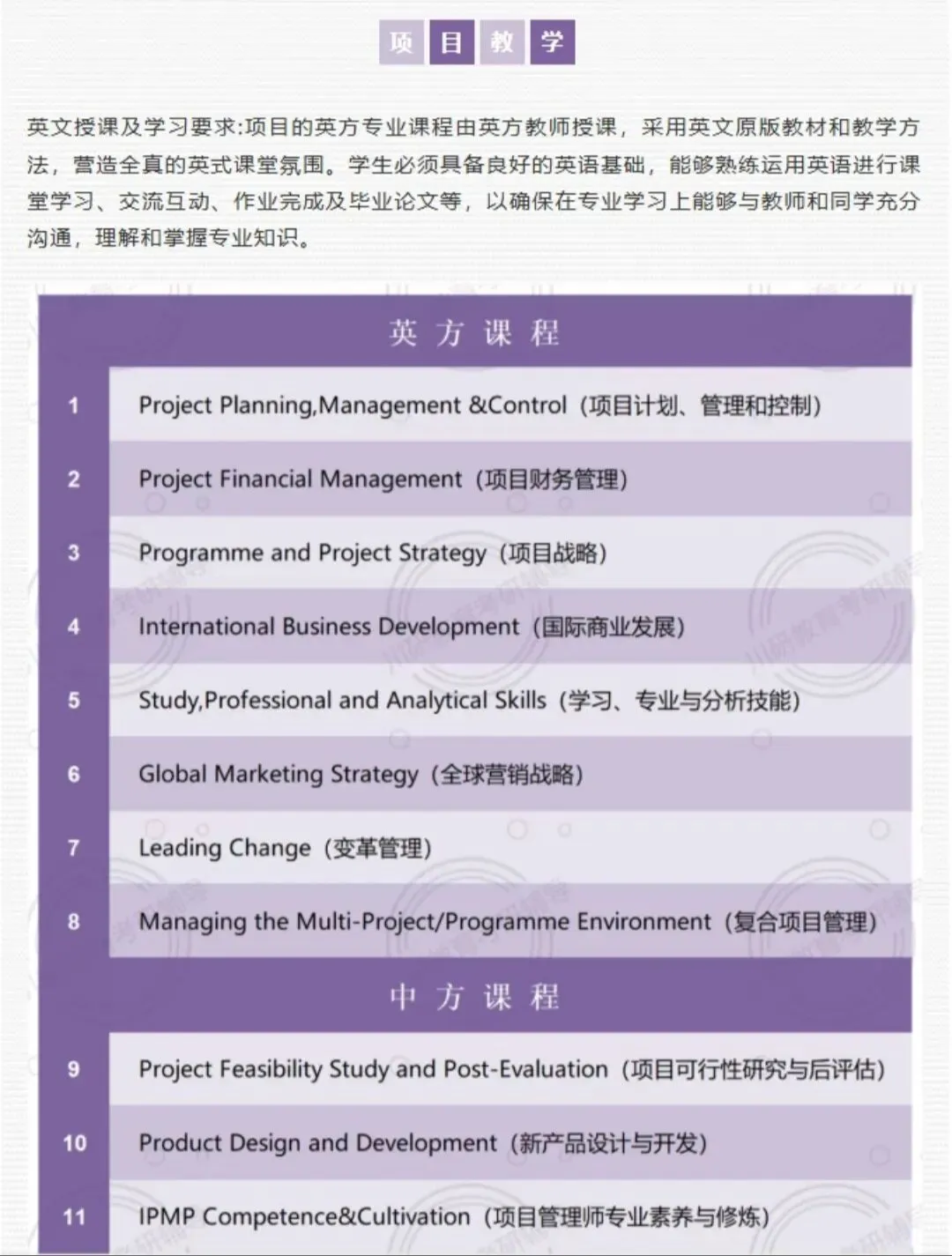 核心必修课(全英文授课):项目计划管理与控制、项目财务管理、项目风险管理、项目领导力、战略项目管理、项目合同与采购管理等10门核心课,夯实专业根基;