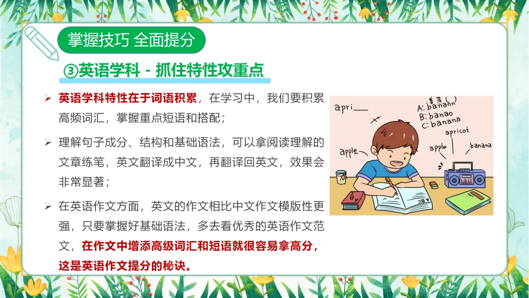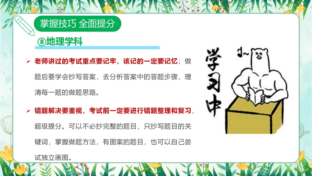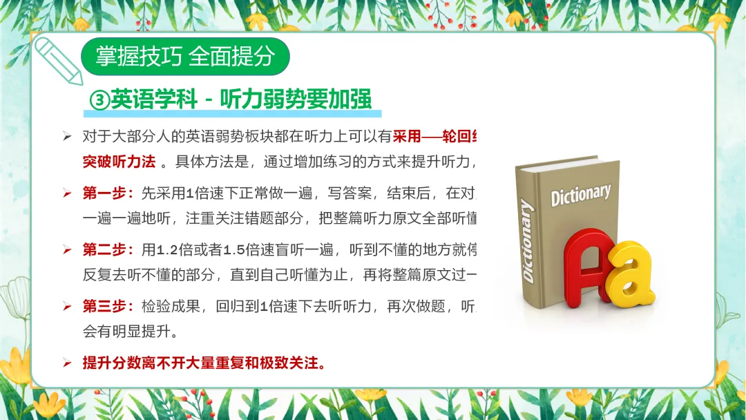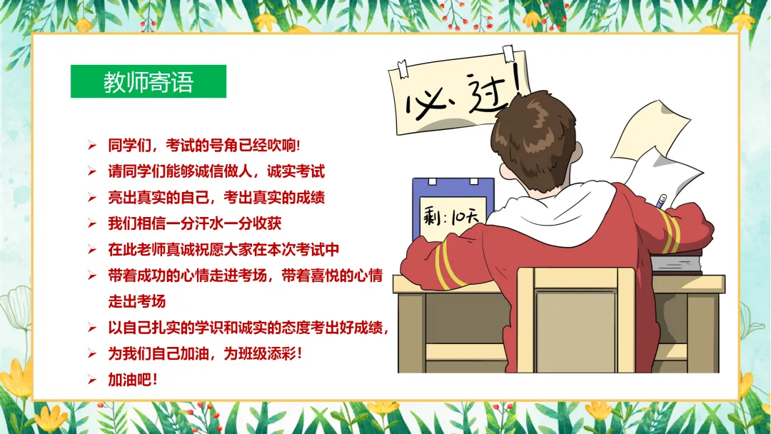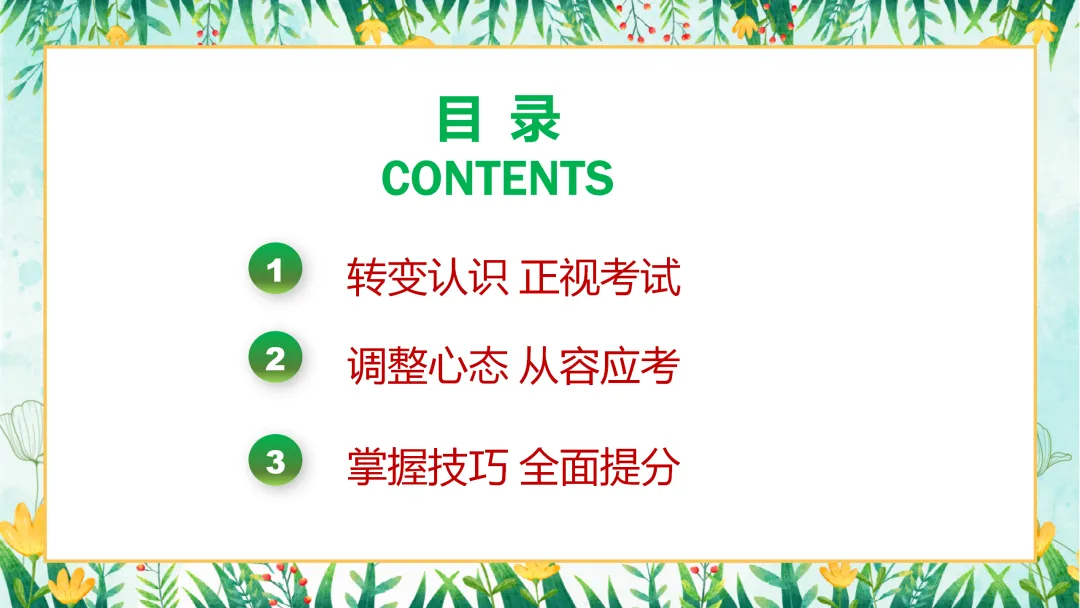 接下来,让我们了解一下今天班会的主要内容。本次班会将围绕三个部分展开:第一部分是转变认识,正视考试;第二部分是调整心态,从容应考;第三部分是掌握技巧,全面提分。通过这三个方面的深入探讨,帮助大家在备考的道路上少走弯路,取得更好的成绩。