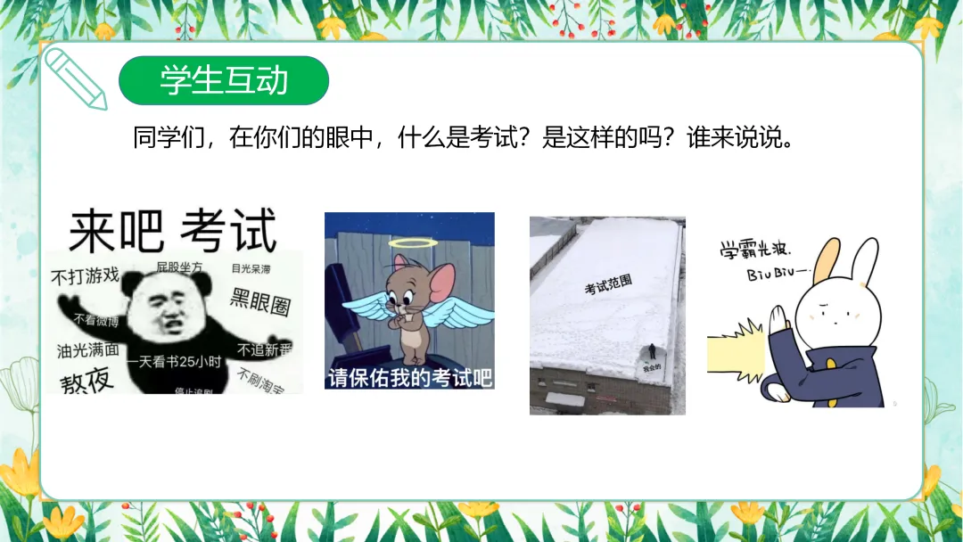 除了刚才提到的这些,还有同学可能会觉得考试就像一场战斗,“来吧考试”,充满了挑战和机遇。无论大家对考试的看法如何,我们都需要明白,考试是学习过程中不可或缺的一部分,它不仅是对我们知识掌握程度的检验,更是对我们学习能力和心理素质的考验。