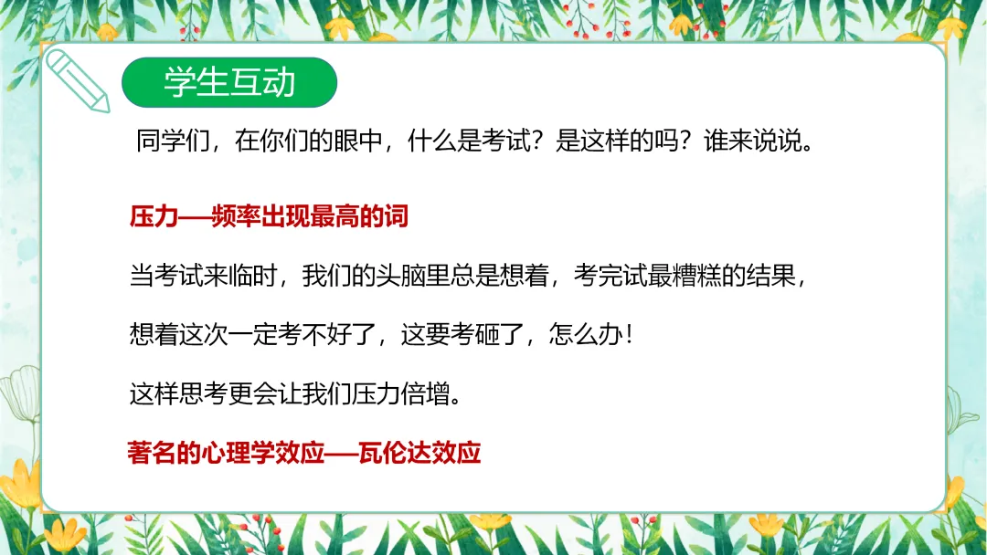 大家的想法都很有代表性,不同的同学对考试有着不同的看法。有的同学可能觉得考试是一种压力,让自己感到焦虑和不安;而有的同学则将考试看作是一次展示自己的机会,希望通过考试证明自己的努力和实力。