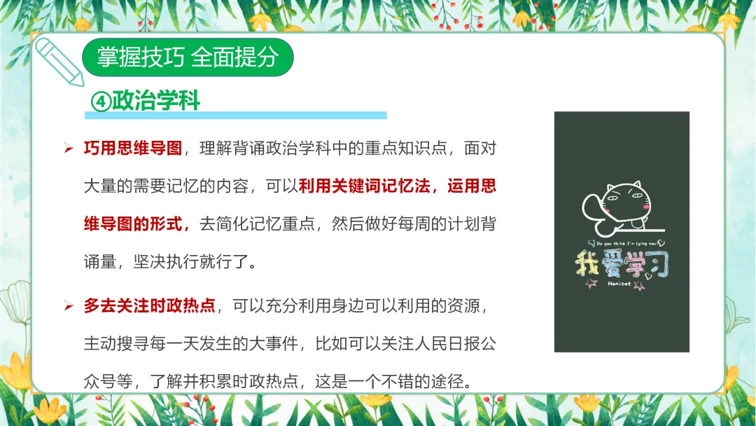 政治学科的学习,我们可以巧用思维导图,理解背诵重点知识点。面对大量需要记忆的内容,我们可以利用关键词记忆法,运用思维导图的形式,简化记忆重点。然后,做好每周的计划背诵量,坚决执行。