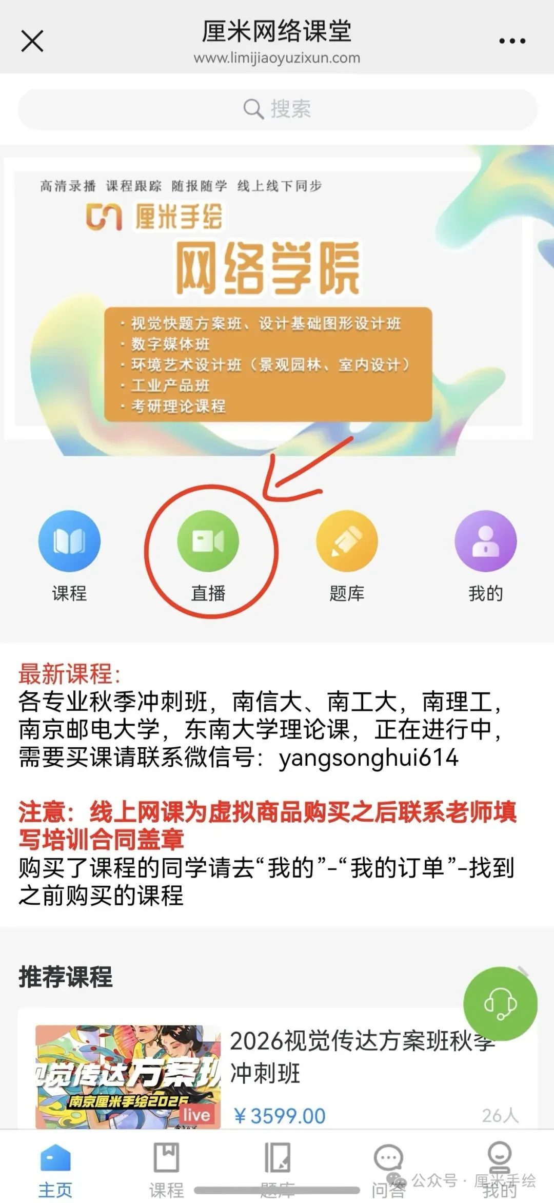 2.然后如下图所示点击>“厘米手绘”进入“厘米手绘线上平台”>然后点击“直播”>点击各专业试听课>“立即报名”就可以看回放,如下图步骤所示:
