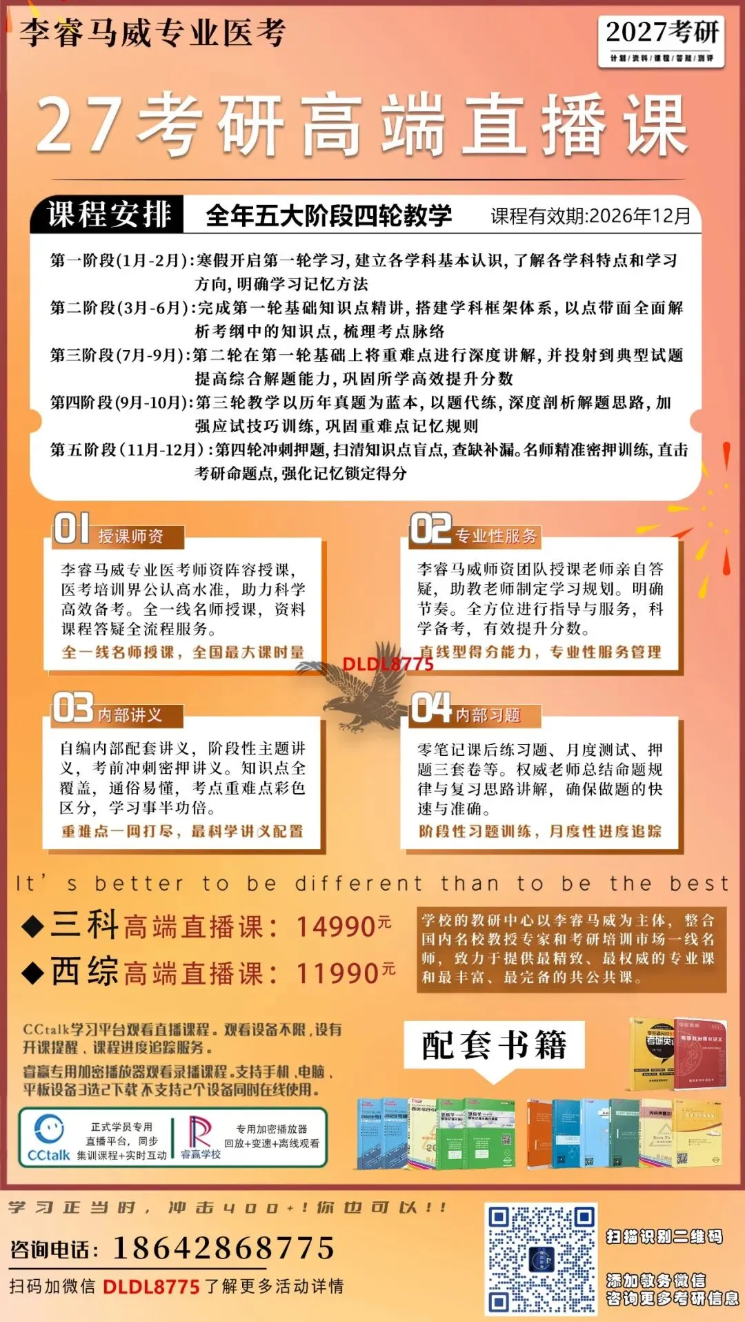 李睿马威专业医考高端直播课,全国课时量最大!全年设计五大阶段4轮教学,满足各层次,各阶段学员的需求。