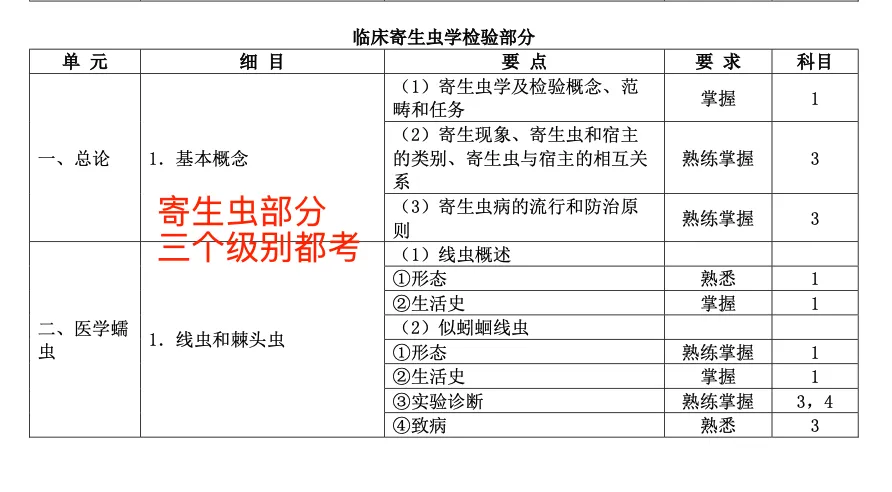 而且,寄生虫、实验室管理这两个科目三个级别都会考,出题的难易度会有区别。