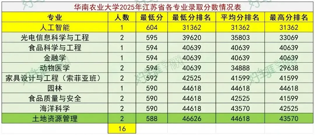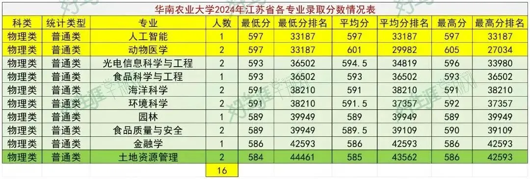 仅招物理类,共录取16人,录取分数线最高的专业是人工智能,604分,全省排名31362,最低的是土地资源管理,588分,全省排名46626。也是仅招物理类,共录取16人,录取分数线最高的专业是人工智能和动物医学,两个专业均为597分,全省排名33187,最低的是土地资源管理,584分,全省排名44461。华南农业大学是一所以农业科学、生命科学为优势,农、工、理、文、史、经、管、法、艺等多学科协调发展的综合性大学。