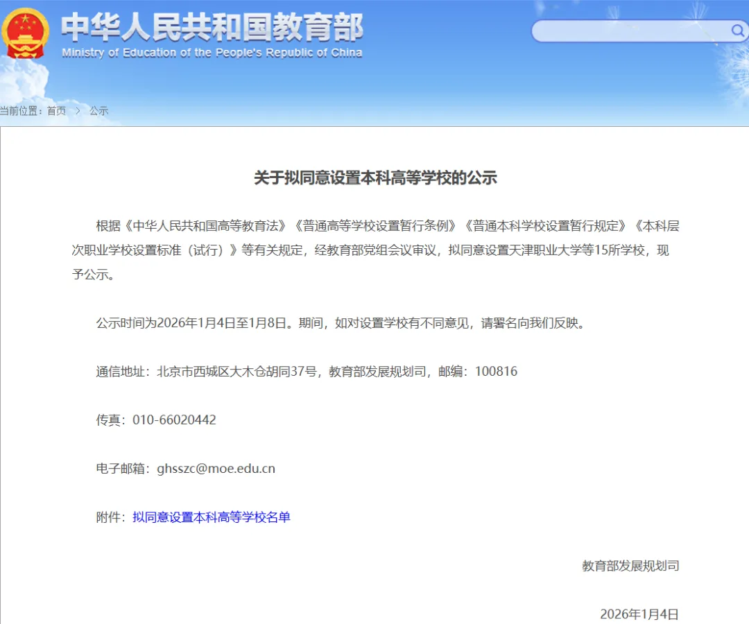 根据《中华人民共和国高等教育法》《普通高等学校设置暂行条例》《普通本科学校设置暂行规定》《本科层次职业学校设置标准(试行)》等有关规定,经教育部党组会议审议,拟同意设置天津职业大学等15所学校,现予公示。公示时间为2026年1月4日至1月8日。