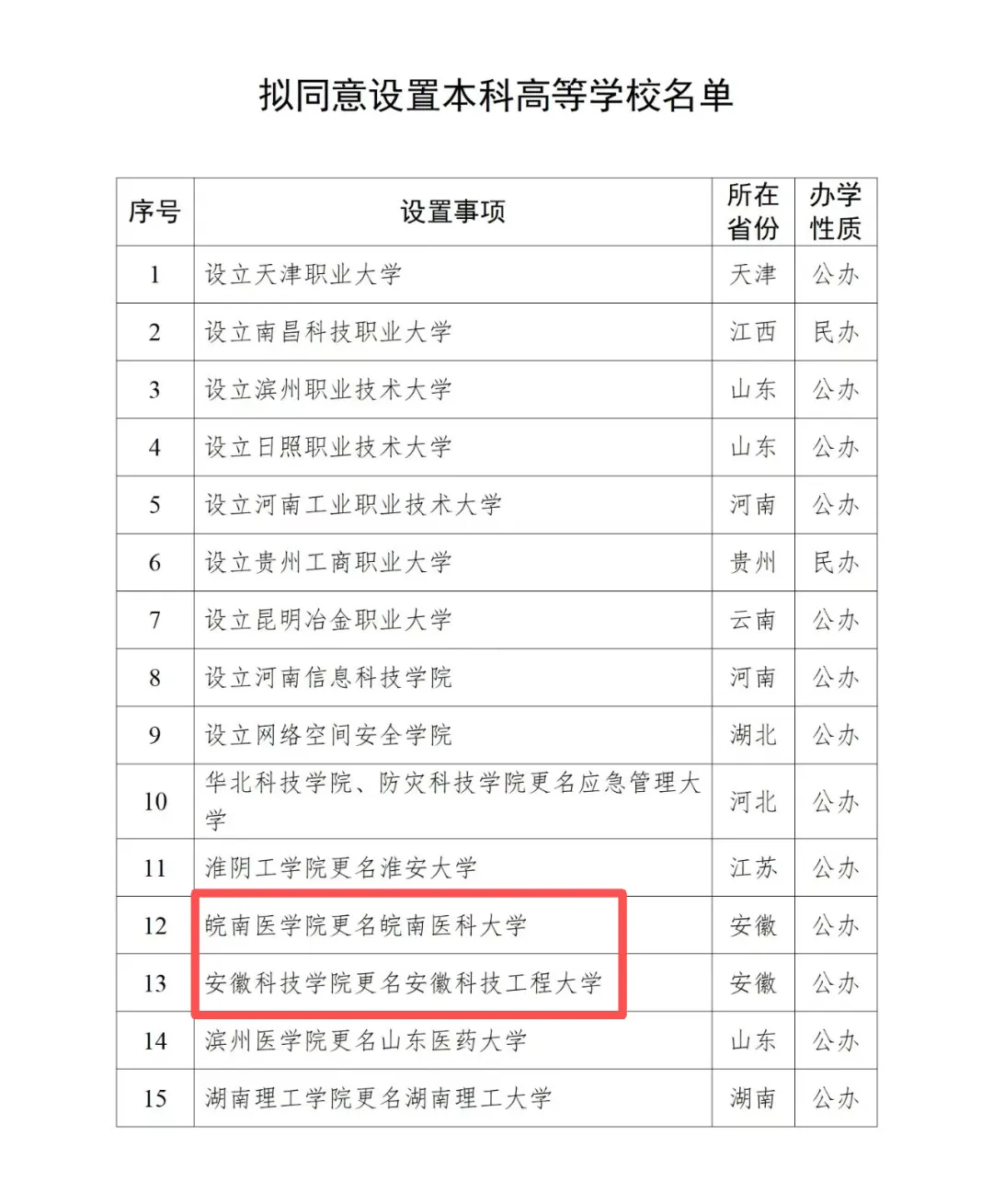 有两所在安徽,分别是皖南医学院更名皖南医科大学,安徽科技学院更名安徽科技工程大学。