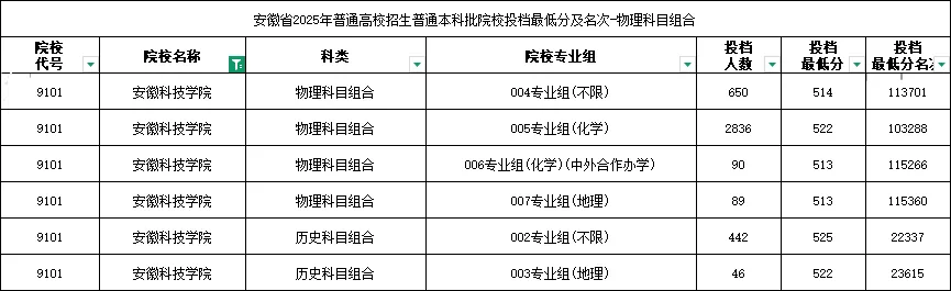 安徽科技学院2025年在安徽省的录取投档线如下: