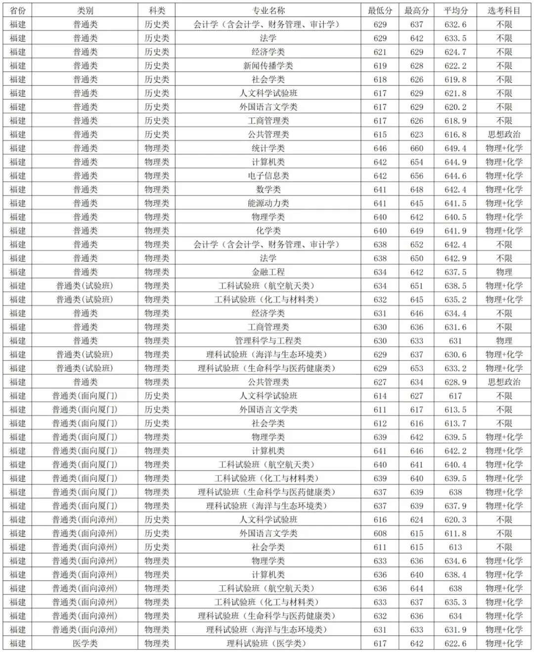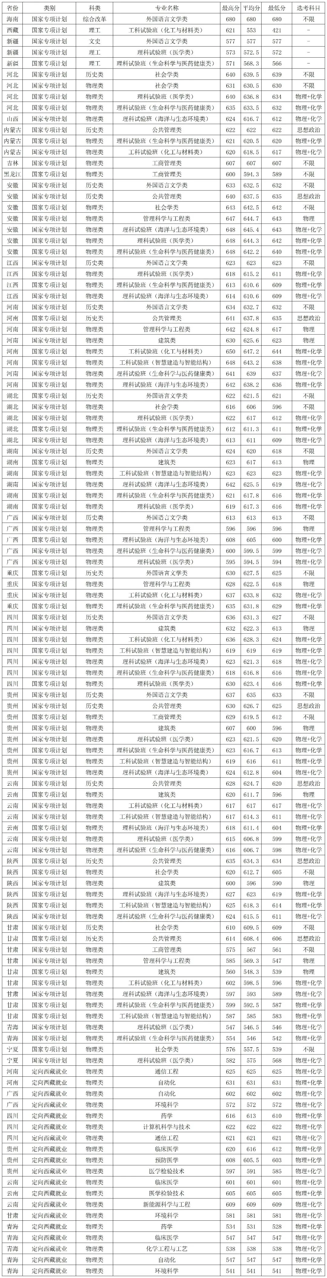 厦门大学2025年国家专项、定向西藏就业在各省各专业录取分数线