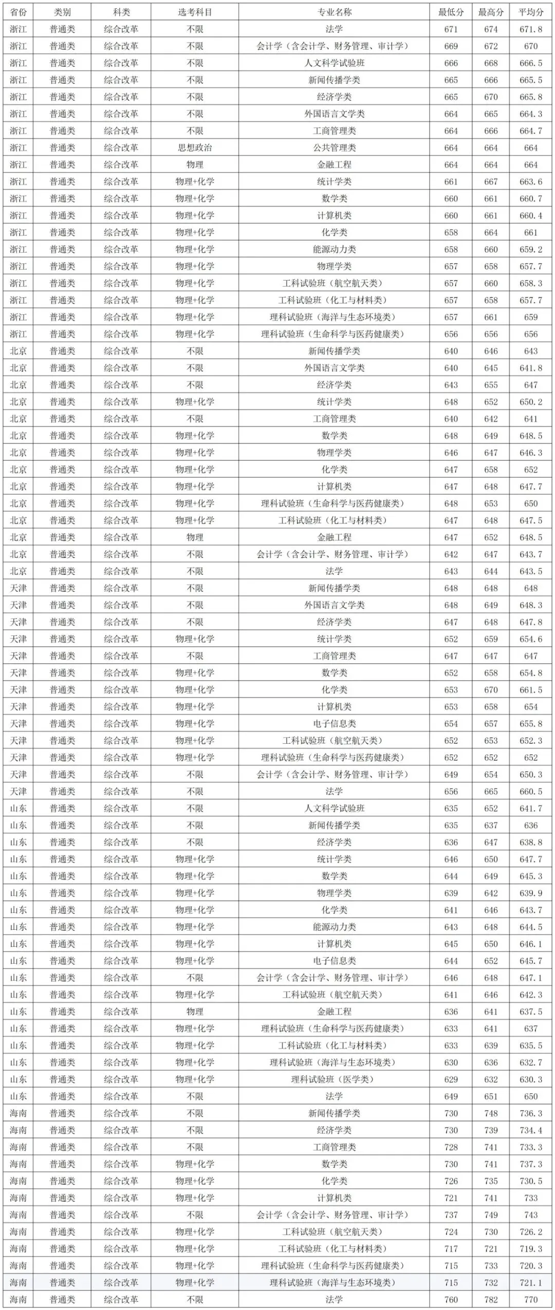 厦门大学2025年在浙江本科批普通类录取分数线较高的专业:法学671分、会计学(含会计学、财务管理、审计学)669分、人文科学试验班666分、新闻传播学类665分、经济学类665分,最低的是理科试验班(生命科学与医药健康类)656分。