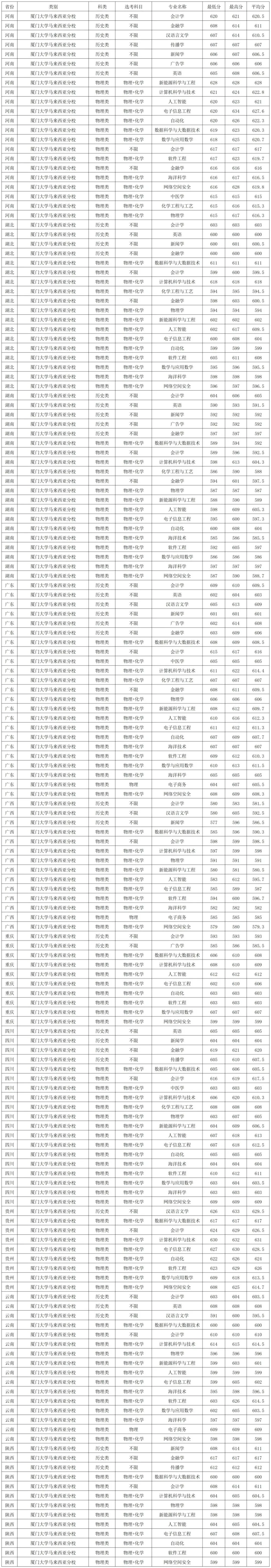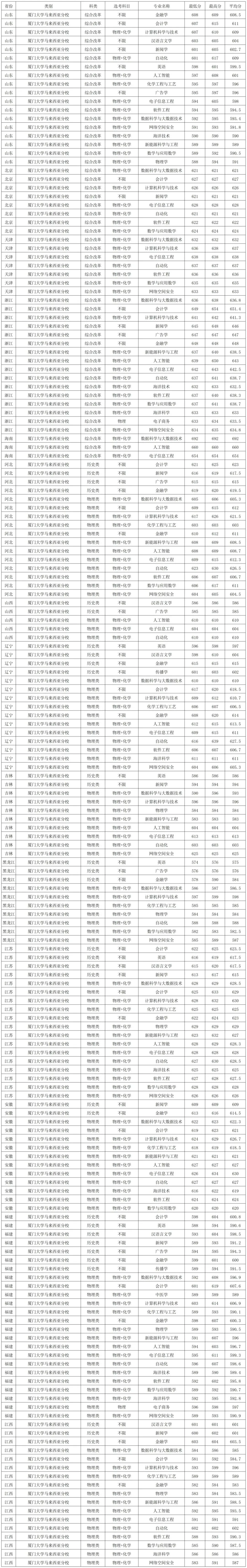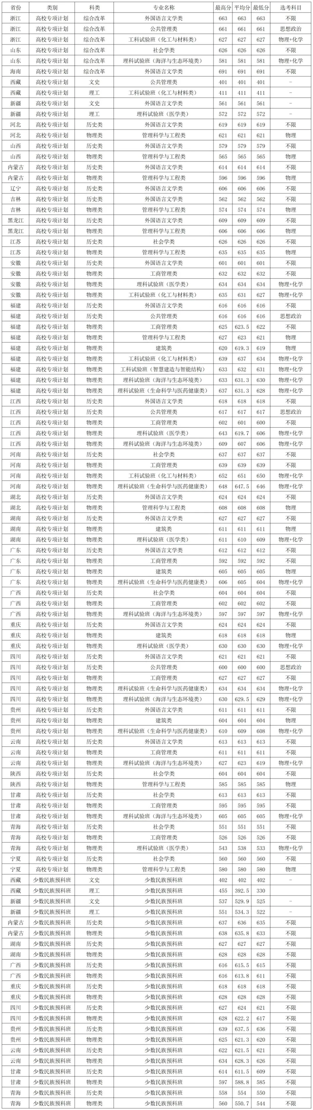 厦门大学2025年高校专项、少数民族预科在各省各专业录取分数线