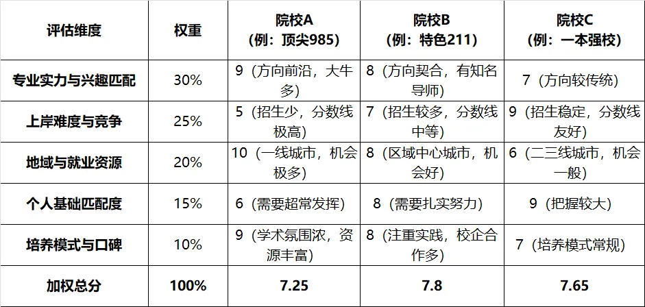 (注:此表仅为示例,你需要根据自身情况设计维度、权重并搜集信息打分。)