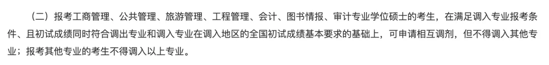 第一志愿报考工商管理、公共管理、旅游管理、工程管理、会计、图书情报、审计等七个专业的考生,只有满足成绩要求、报考条件,可在这几个专业内调剂,但不能调剂到其他专业。同样的,报考其他专业的考生也不得调入以上专业。