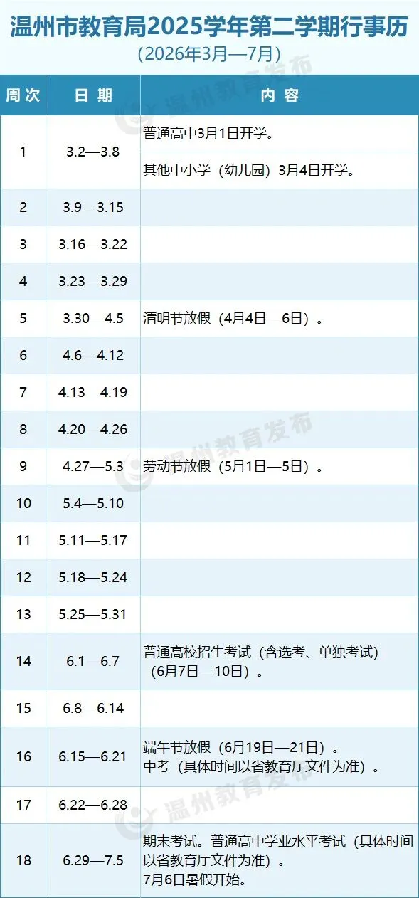 1月4日,温州市教育局正式发布了2025学年第二学期行事历(2026年3月—7月)。孩子下学期什么时候开学?大型考试安排在何时?暑假又是何时开启呢?所有关键时间点一图掌握!