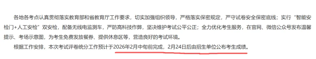 2025年12月22日,江西省教育厅发布的江西省2026年全国硕士研究生招生考试(初试)顺利结束公告中,有提到评卷统分工作预计于2026年2月中旬前完成,2月24日后由招生单位公布考生成绩。也就是正月初八出分!