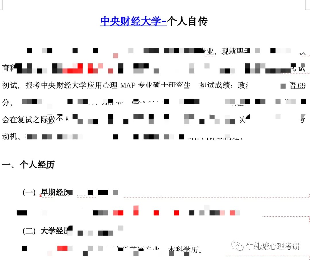 ①针对院校复试材料准备:讲解针对院校的复试流程&注意事项&需要提交的材料。部分院校对于基本情况审核有一定把控,比如,北师大需要个人陈述、北大需要个人陈述、中财需要个人自传、个人专业素质表等一堆材料。牛轧糖已经为小伙伴们准备好了模板....还有师兄师姐1v1批改反馈。