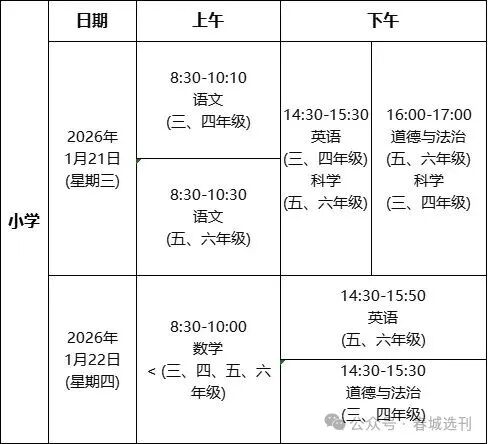 一、二年级:多元化综合测评,2026年1月23日前完成。三至六年级:1月20日-21日。