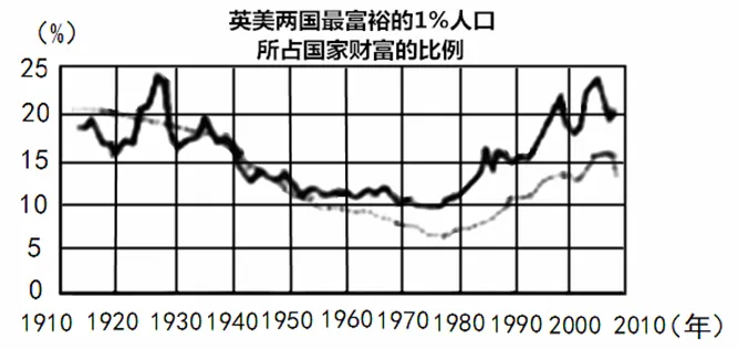答案C,根据材料及所学可知,二战后至70年代,英美普遍推行“福利国家”政策,通过税收调节、社会保障、公共服务等手段缩小贫富差距,这一时期最富裕1%人口的财富占比短暂下降;但20世纪80年代后新自由主义兴起后,最富裕1%人口的财富占比呈现上升趋势。由此可见,“福利国家”政策虽能缓解贫富分化,却无法从根本上解决问题,C项正确。图表主要体现的是英美最富裕的1%人口占国家财富比例的变化,并未涉及科技进步对英美富人收入差距的影响,经济“滞胀”主要发生在20世纪70年代的英美,是“高通胀、高失业、低增长”的经济困境,并非“社会不平等加剧”的直接原因, A、D两项与题意无关;图表未涉及“中间阶层”的规模,且“中间阶层扩大”在一定程度上“改变了社会结构”,B项与基本史实不符。