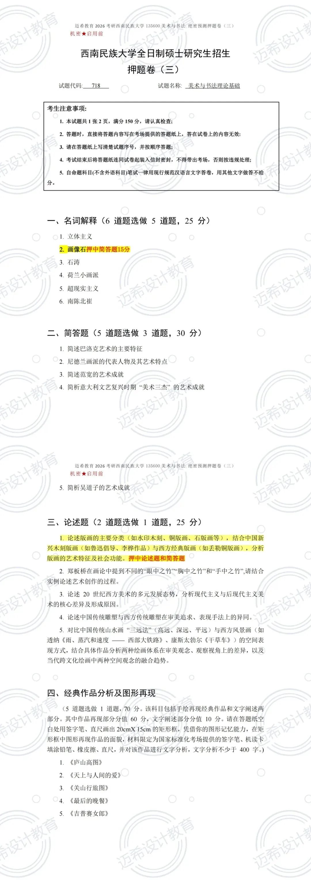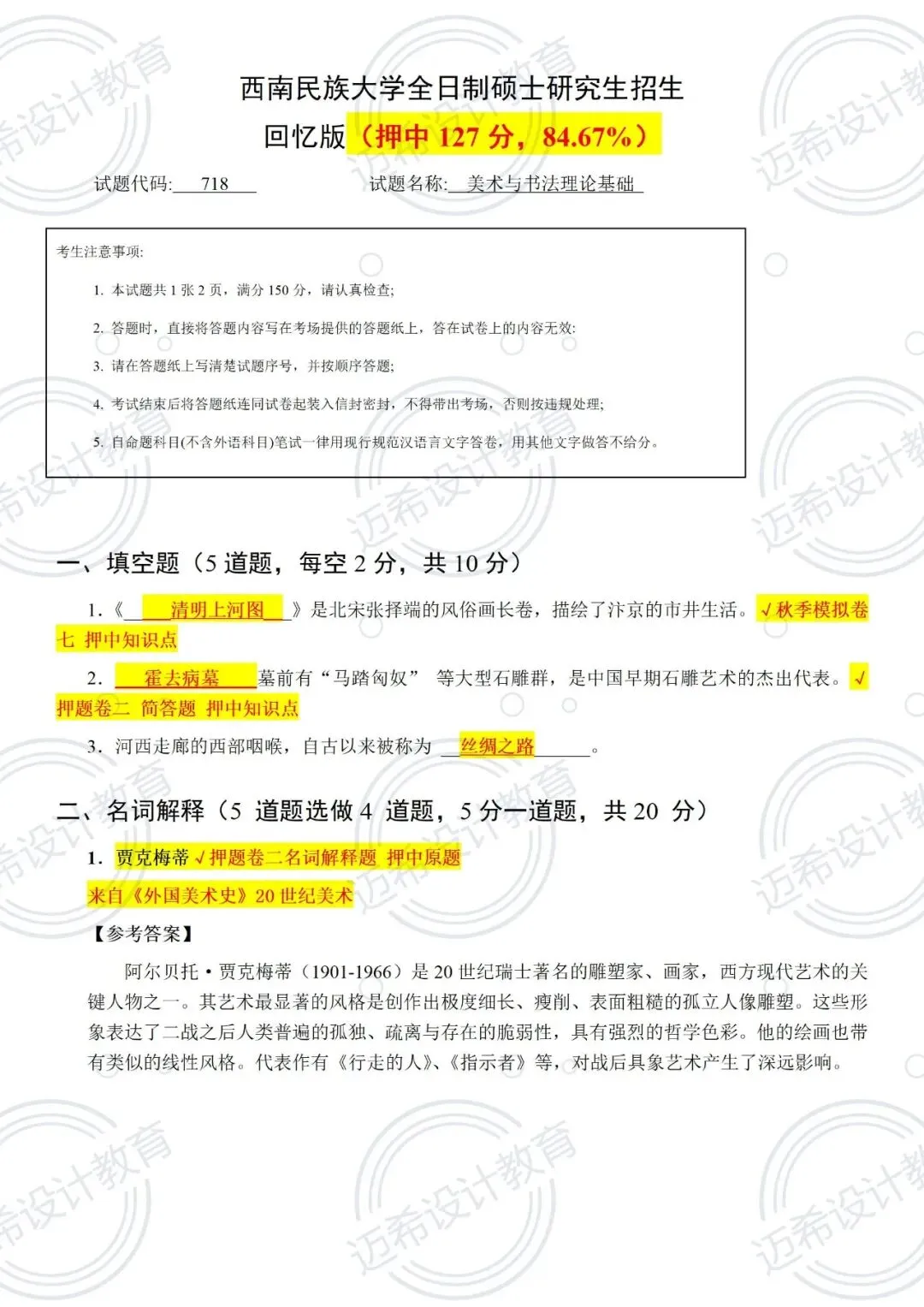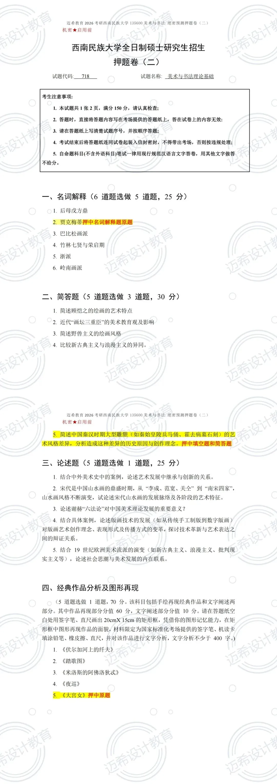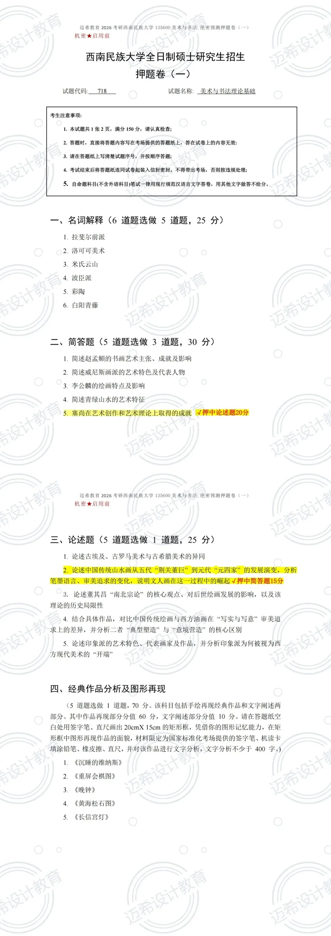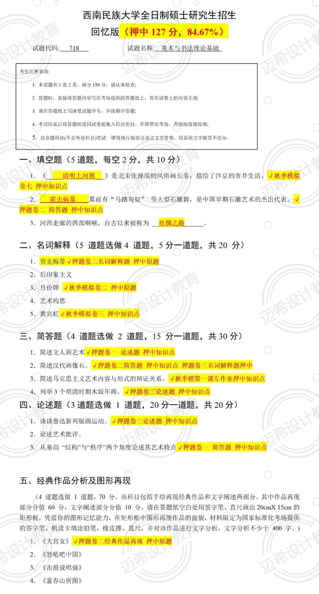 谁懂啊家人们!西南民族大学 718 美术与书法理论基础考研,直接押中 127 分!总押题 150 分,押题率高达 84.67%✅ 备考的宝子们直接狂喜,考场看到题直接笑出声!