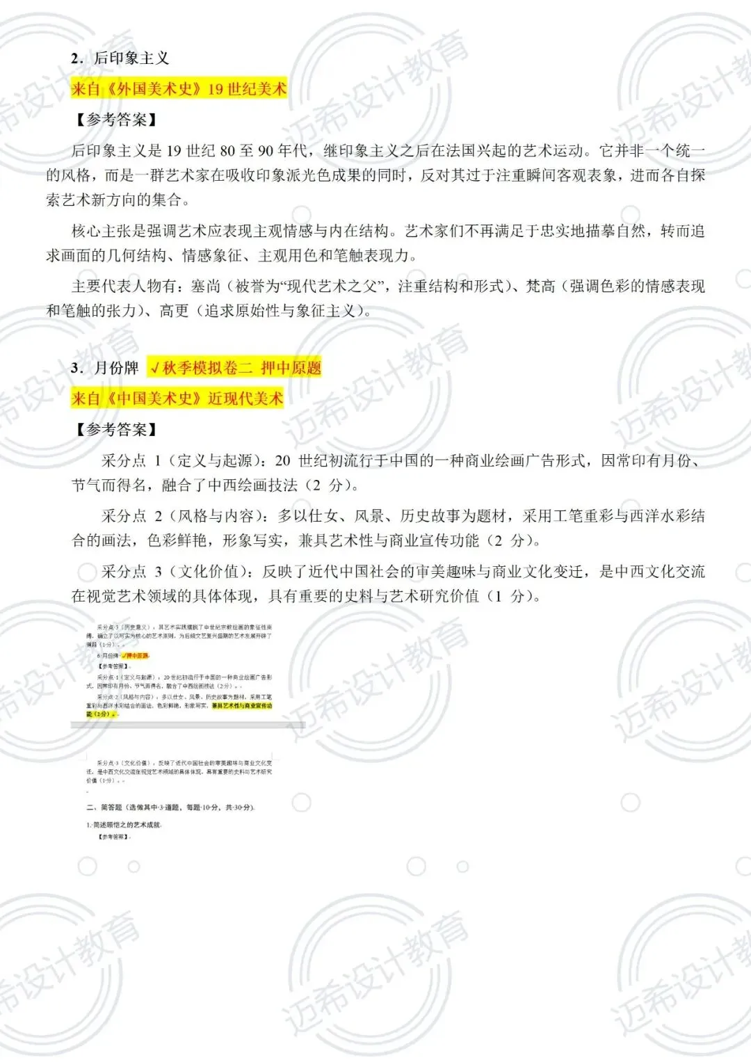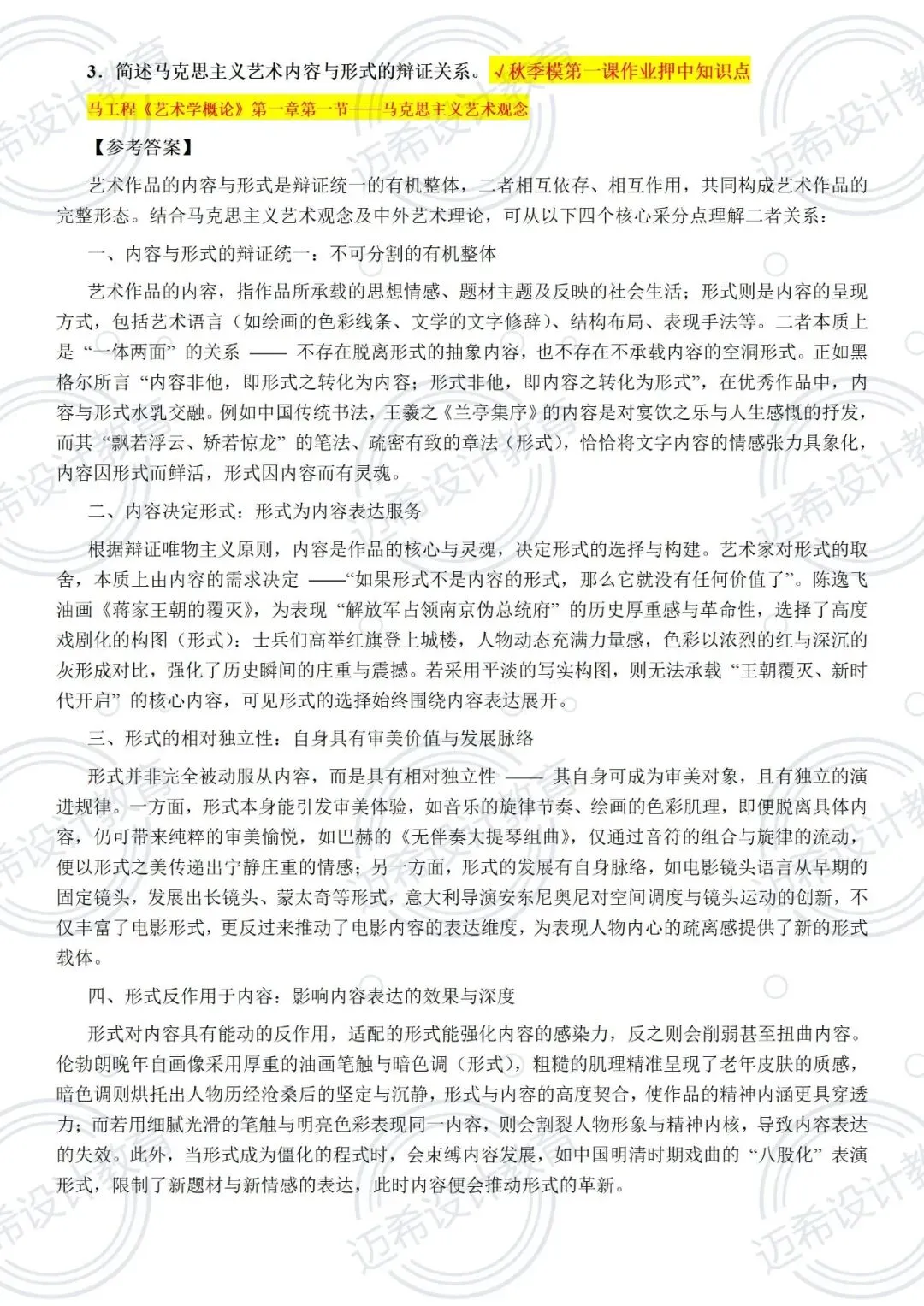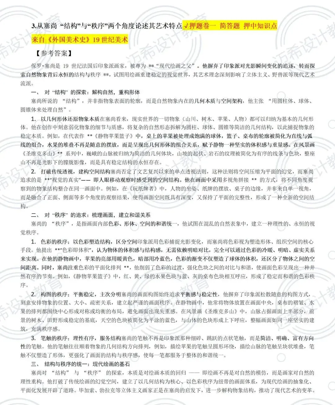 ✅ 718 冲刺课:20 课时专攻答题技巧,结合押题卷高频考点(鲁迅新兴版画、塞尚艺术特点)做专项练习,主观题按 “观点 + 案例 + 分析” 结构答题