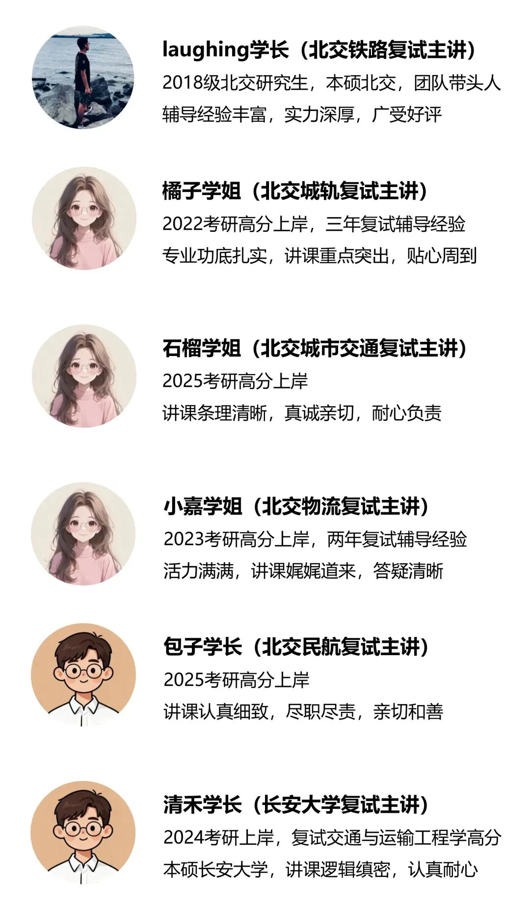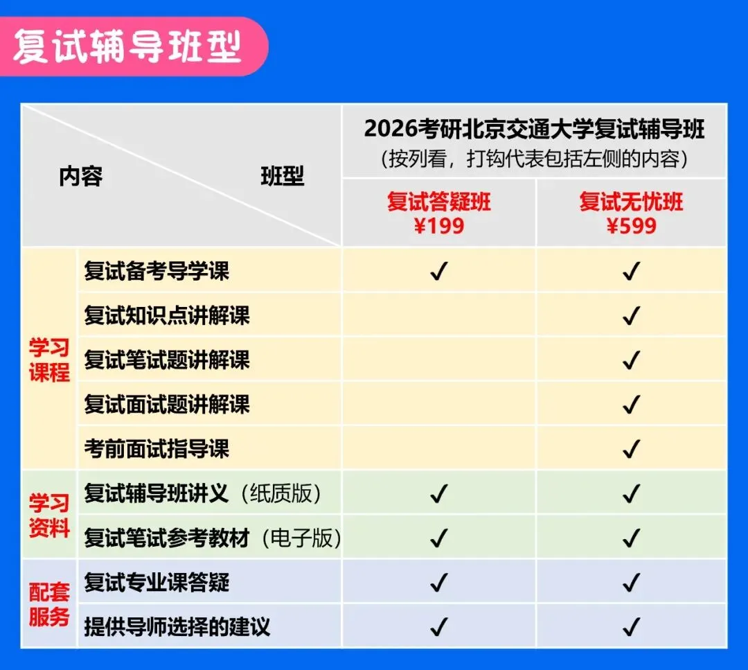 我们目前做的复试辅导是北京交通大学交通运输学院和长安大学运输工程学院的复试科目。我们针对各个复试科目提供相应的备考资料课程,以及答疑指导服务,六位研究生学长学姐会全力帮助大家准备复试各个环节,不仅助力上岸,更要助力高分上岸,帮大家赢得更多的奖学金。