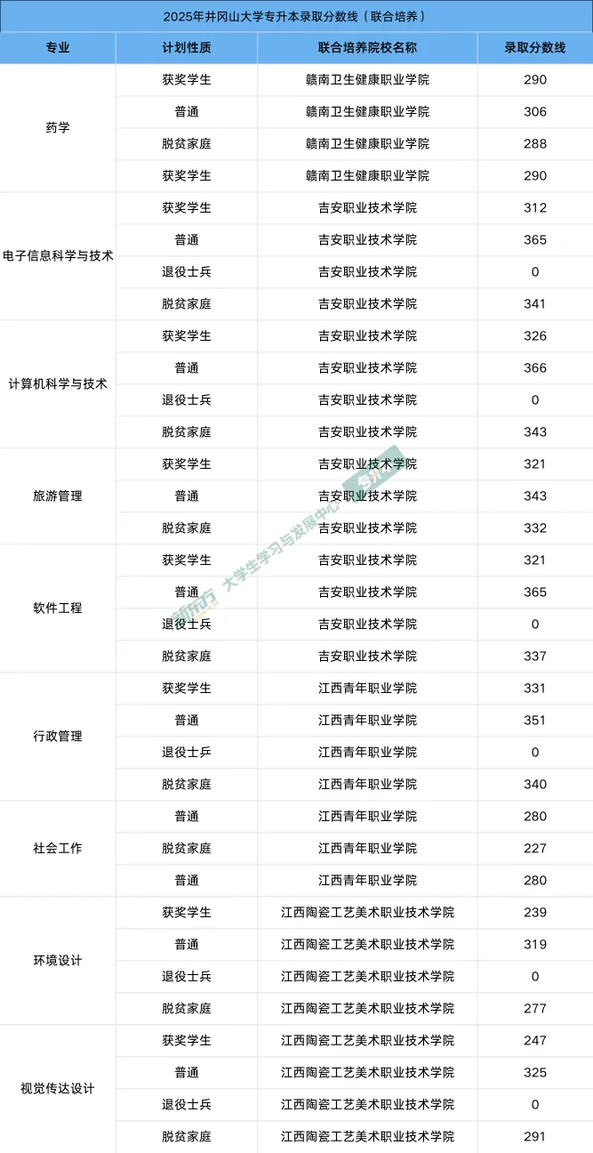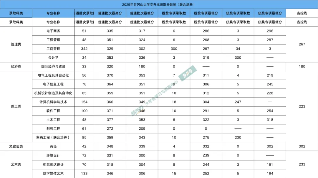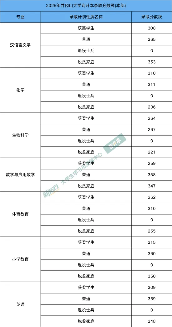 2025年井冈山大学专升本录取分数线公布,共7个专业进行招生。其中,汉语言文学普通批次投档分为365分;化学普通批次投档分为311分;生物科学普通批次投档分为267分;数学与应用数学普通批次投档分为358分;体育教育普通批次投档分为310分;小学教育普通批次投档分为360分;英语普通批次投档分为359分。