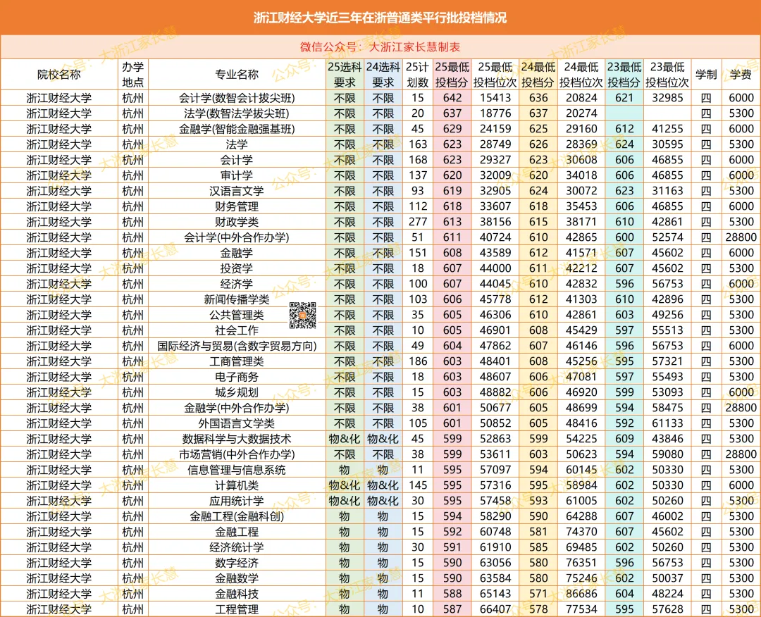 浙江财经大学2025年在浙平行投档情况