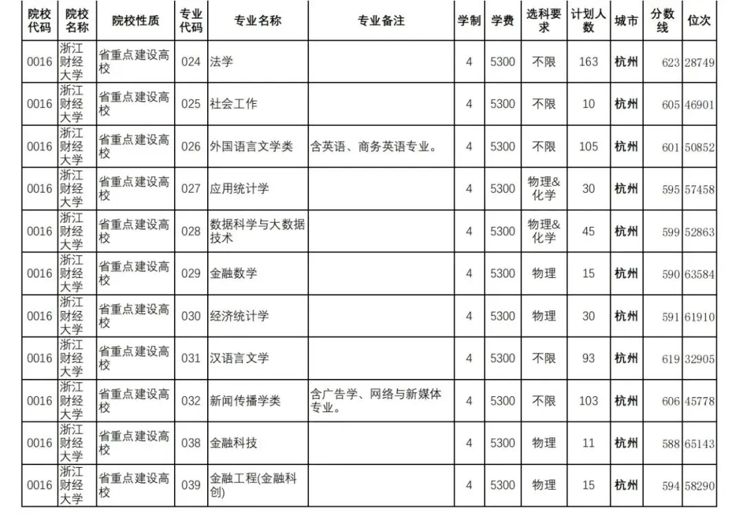 浙江财经大学2025年各类别录取分数线汇总