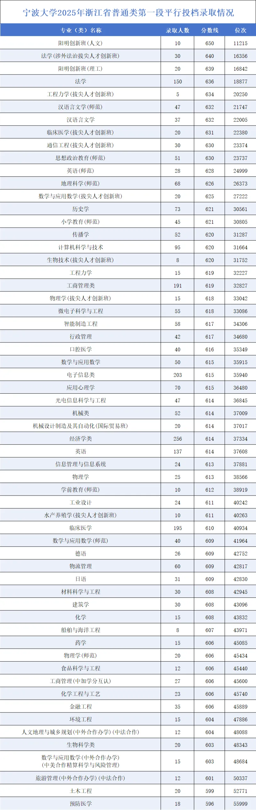 浙江省普通类第一段平行志愿投档录取,宁波大学所有在招专业(类)投档分均超过特殊类型招生控制线,本次录取投档最高分出现在阳明创新班(人文),投档分为650分。宁波大学“双一流”建设对提升生源质量效果明显,2025年,学校在浙江省普通类招生计划增加137个的情况下,超过60%的专业(类)投档分高出特殊类型招生控制线20分及以上,85.53%录取考生的分数在612分及以上,连续三年超过83%,创历史新高。普通类平行批阳明创新班(人文)专业投档线最高,为650,省排11215;预防医学专业投档线最低,为596,省排55999。