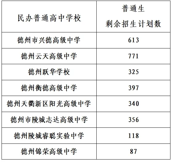 四、民办普通高中学校剩余招生计划数