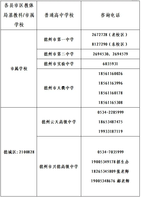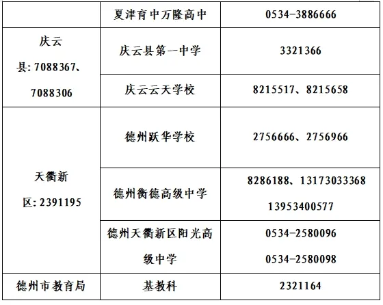 五、各县市区教体局基教科及普通高中学校招生录取咨询电话