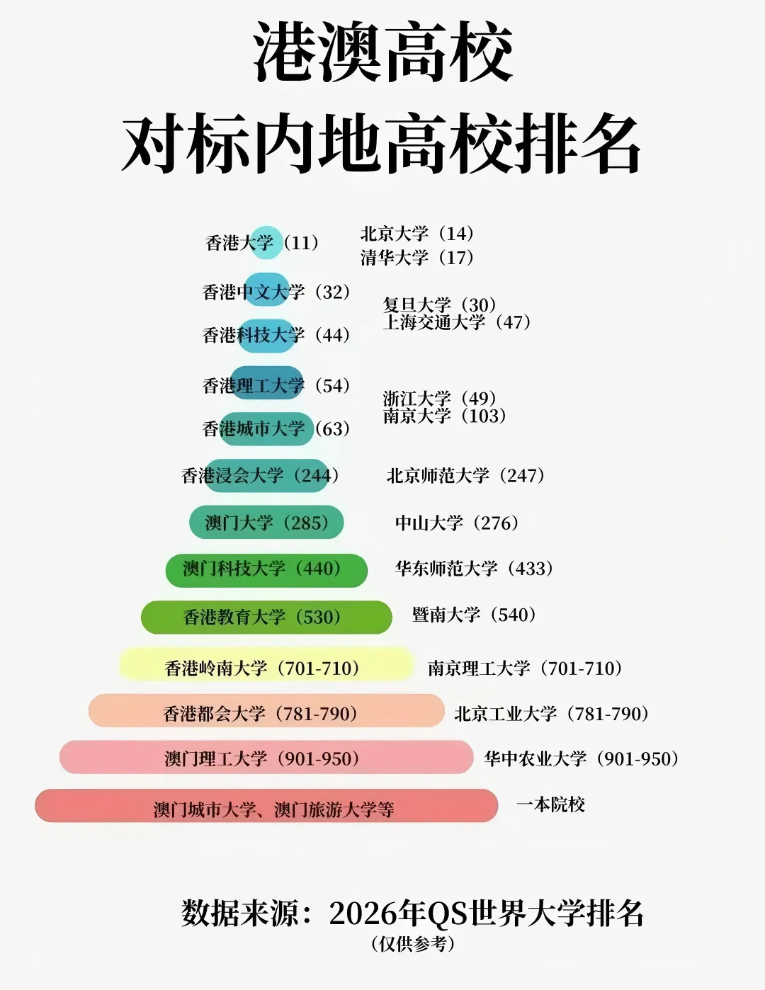 近年来,港澳升学热度飙升,高考录取分数线也水涨船高!对于2026年及低年级考生和家长来说,这些港澳院校的实力究竟如何?值得报考吗?它们的录取门槛究竟有多高?高考需要多少分、排名多少才有机会?