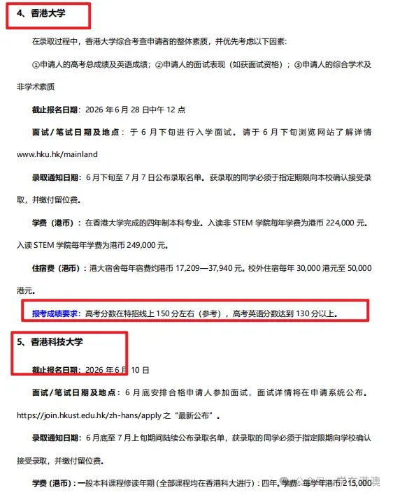 港大、港科大等顶尖院校建议超一本线 150 分以上,其他院校要求达一本线或二本线(如香港恒生大学、香港都会大学);