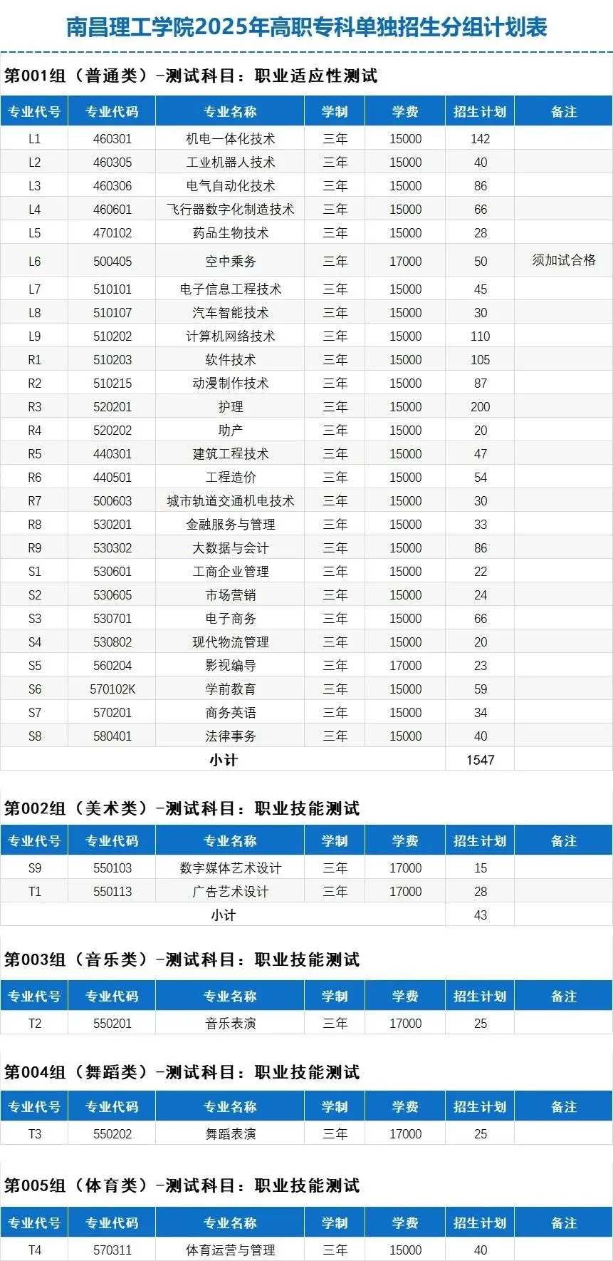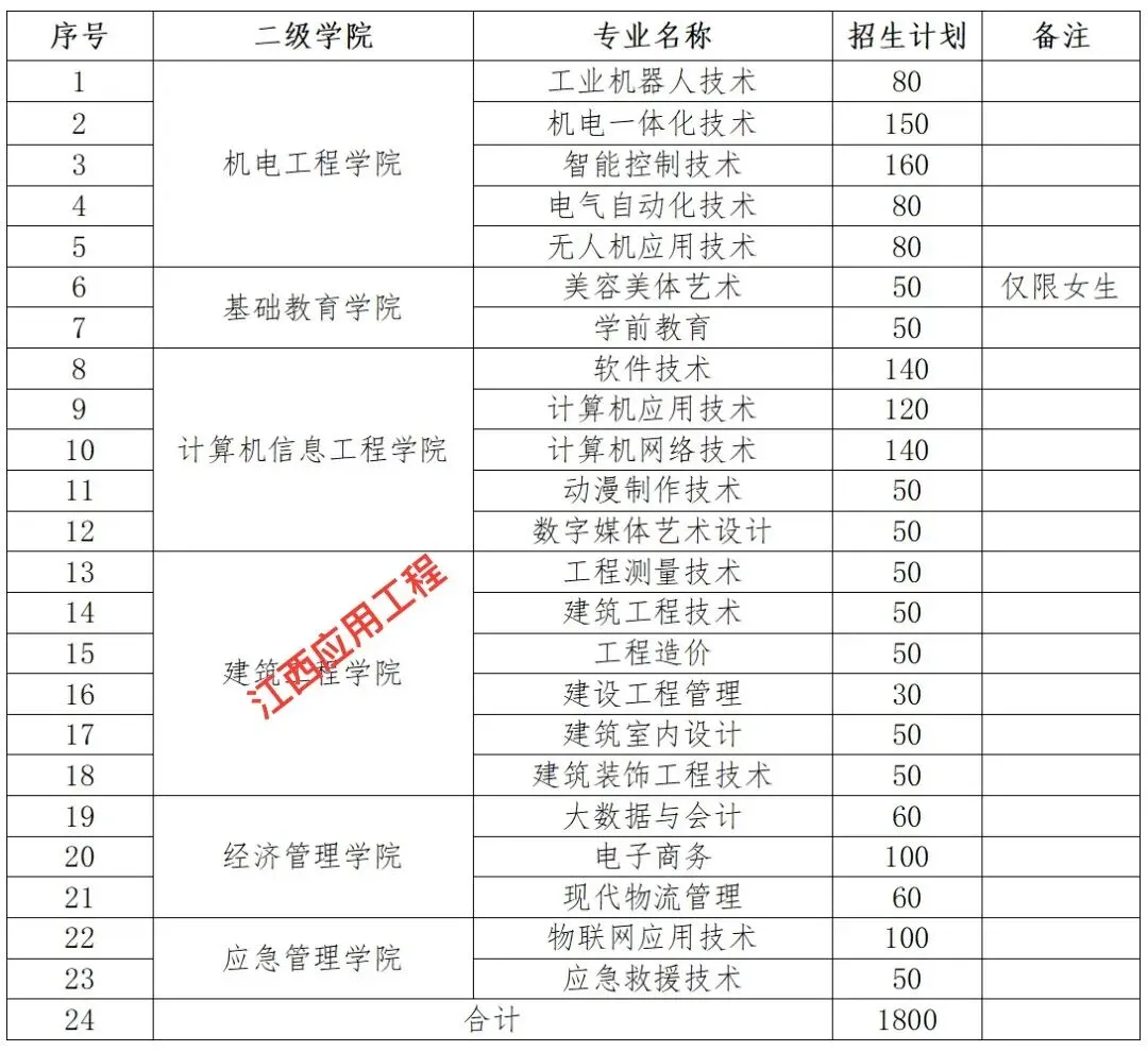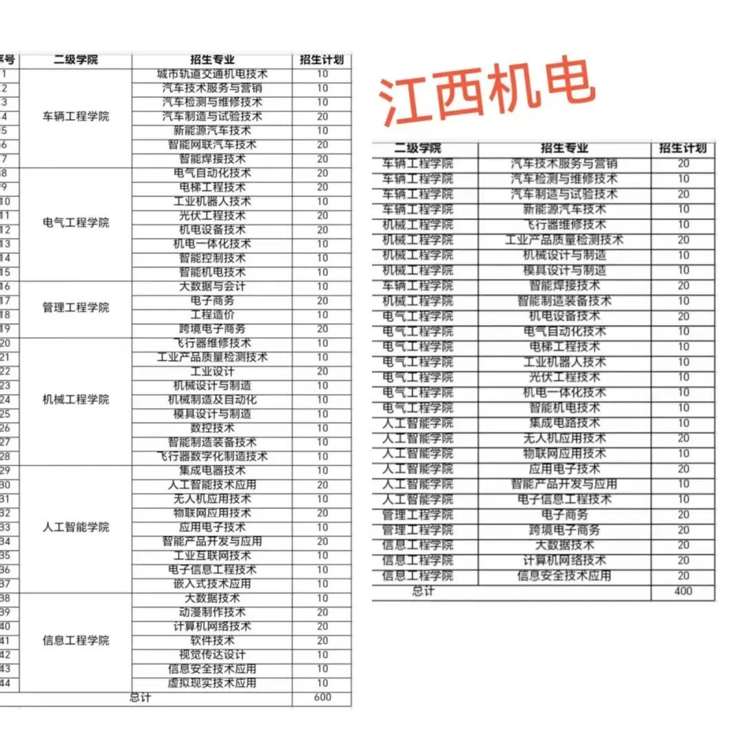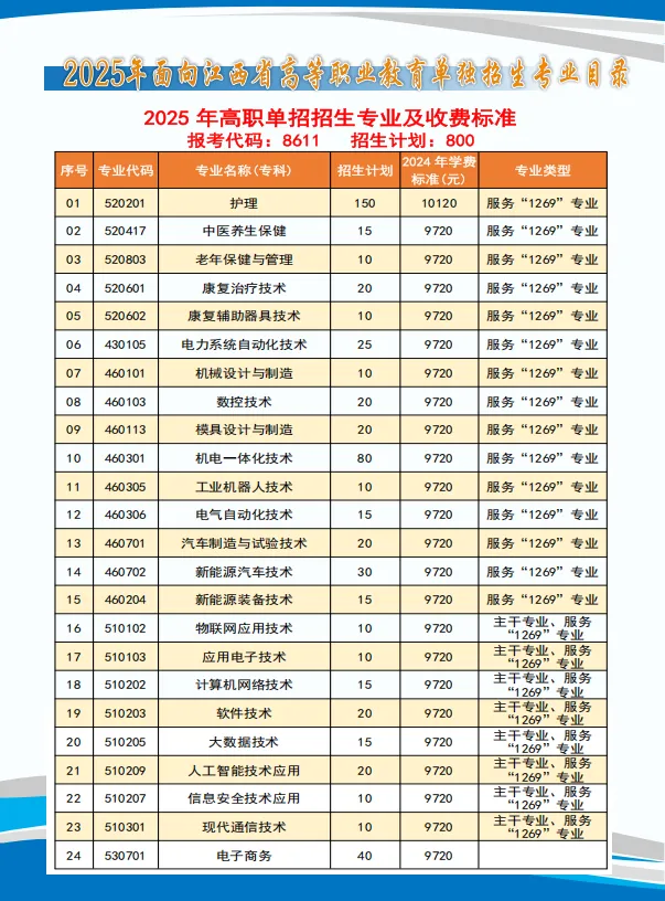 招生计划为545人,招生专业名称见附表1,已完成江西省2025年普通高考报名的考生均可填报。考试科目:文化素质考试+职业技能测试。招生计划320人,招生专业名称见附表2,已完成江西省2025年普通高考报名的考生均可填报。考试科目:文化素质考试+职业技能测试。考生只能根据填报专业参加其中一类职业技能测试考试。若同时填报不同类别(普通类、艺术类)的专业,学校将以考生填报的第一专业志愿认定考生参加2025年单招考试的专业类别,且普通类职业技能测试成绩与艺术类职业技能测试成绩不得互相通用。