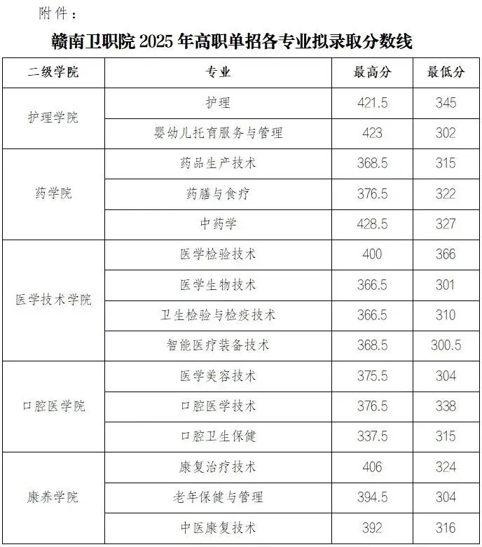 根据江西省教育考试院《关于做好全省2025年高等职业教育单独招生工作的通知》(赣教考字〔2023〕28号)文件精神,我校已严格按要求完成单独招生考试录取工作,现将录取分数线公布如下: